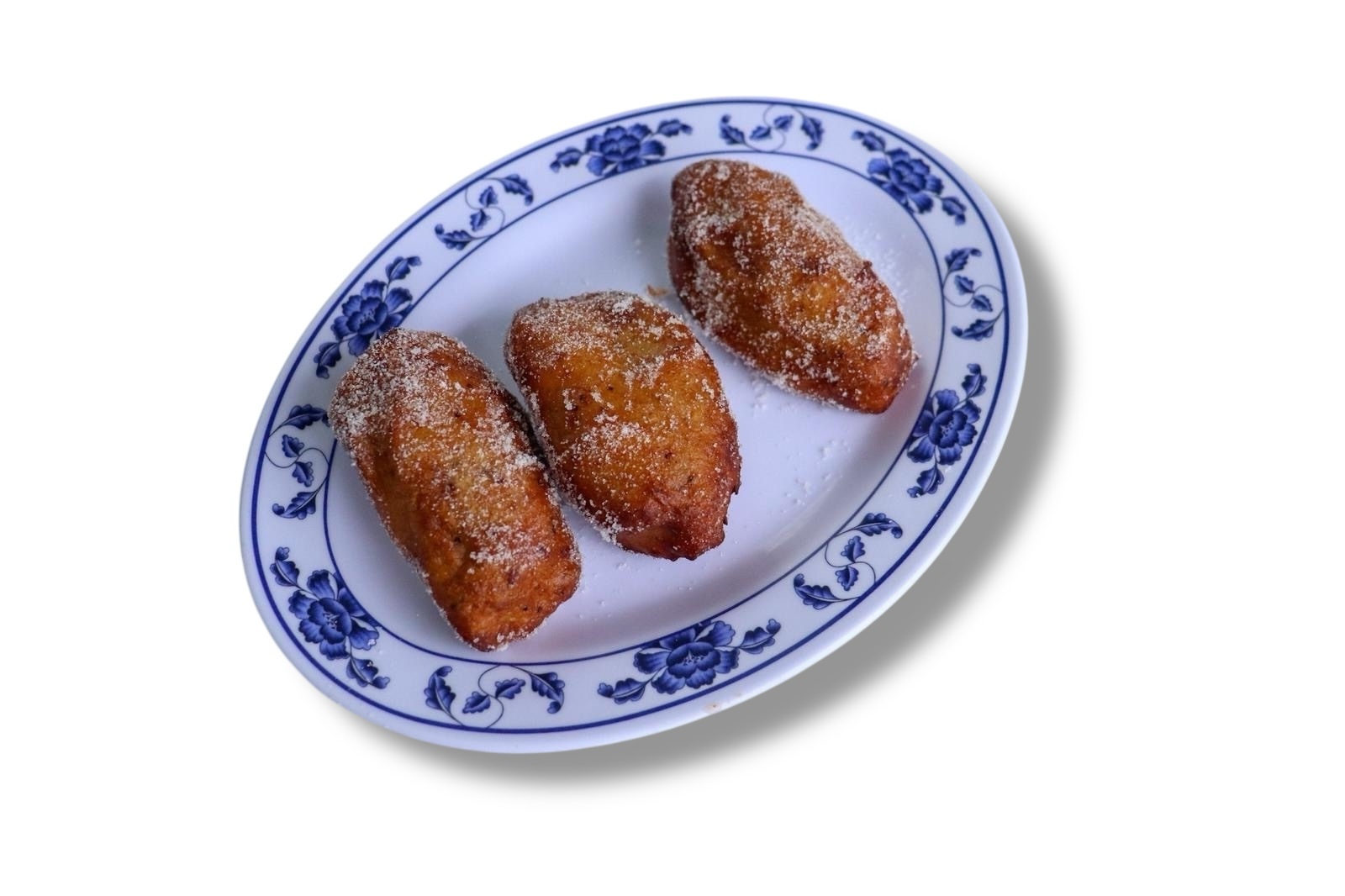 Sweet plantain based dumplings, stuffed with vanilla custard. Fried and rolled in sugar