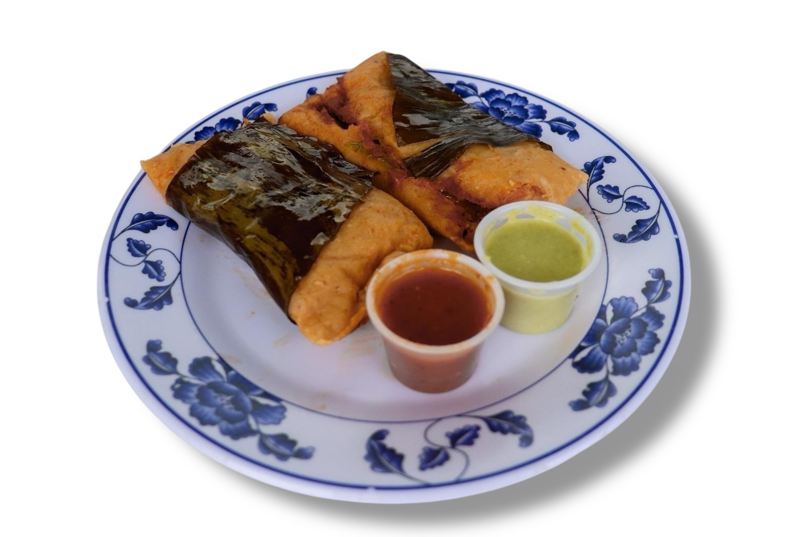 Salvadoran style tamales stuffed with pork or chicken wrapped in a banana leaf